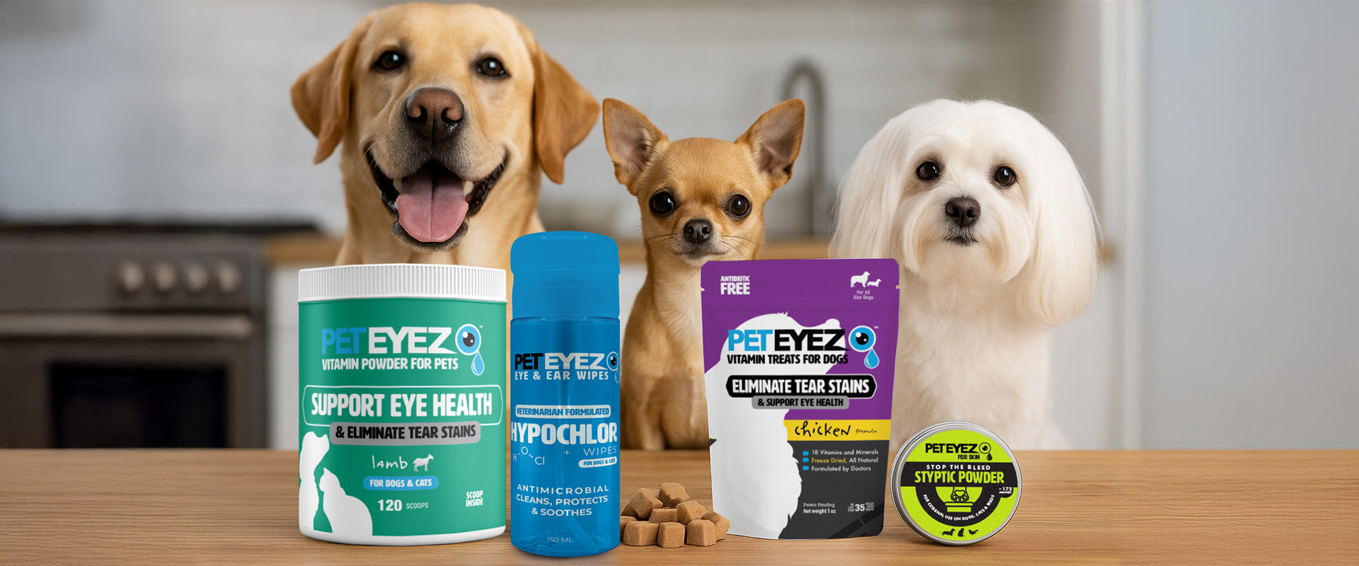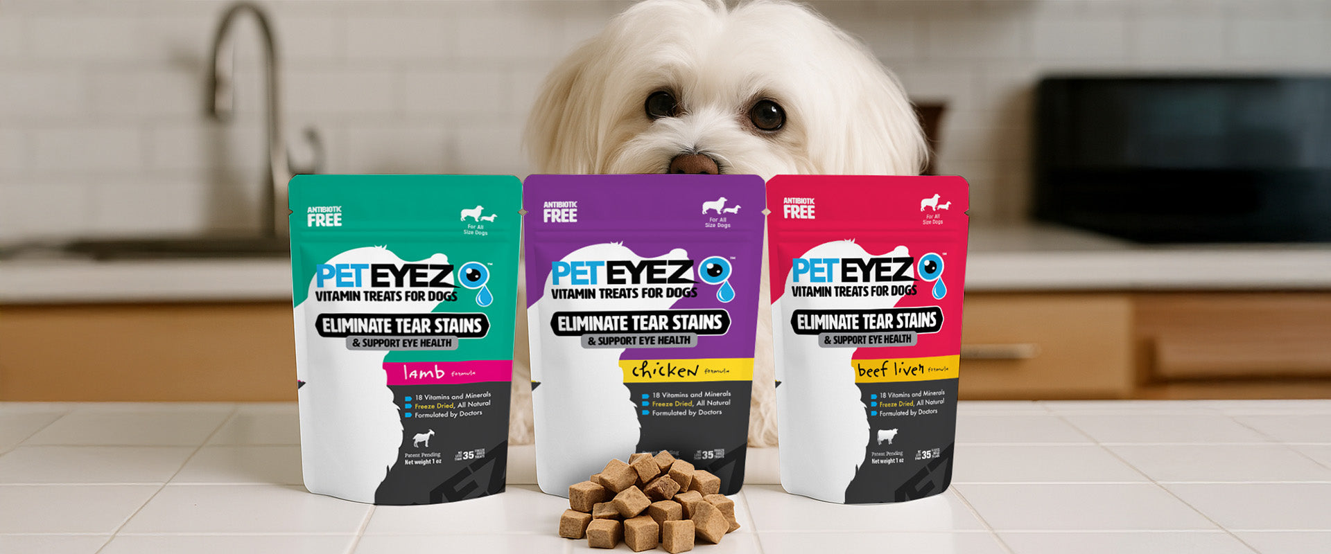 Pet Eyez™ Vitamin Treats are all-natural highly functional freeze-dried treats that eliminate the buildup of tear stains for both dogs and cats in 30 days or less, guaranteed*. Helps with Dry Eyes, Irritated Eyes, TEAR STAINS, Glaucoma, Cataracts, Cherry-Eye and so much more.